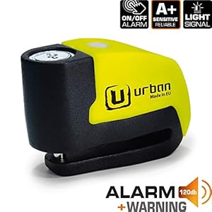 Antirrobo de disco con alarma de 120dba y avisador, tiene un eje de 6mm universal, ideal para los orificios exteriores del disco; si dispones de orificios más grandes en el interior del disco mejor un eje de 10mm con doble cierre como el urban ur10 (homologado)